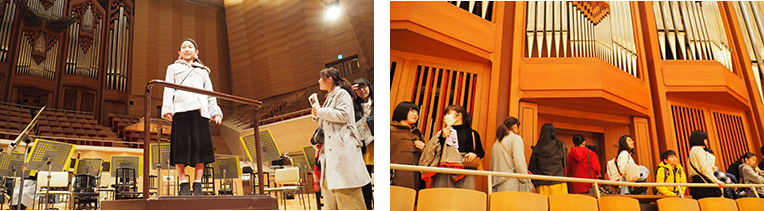 ホール見学では、指揮台の上に立って、指揮者から見える客席を体感したり、パイプオルガンを間近で見学したりと、