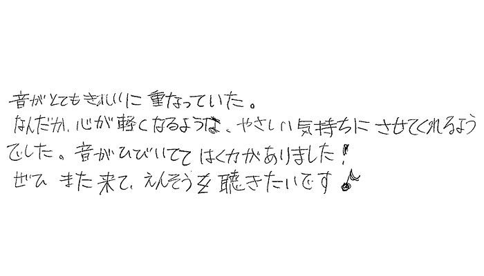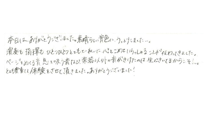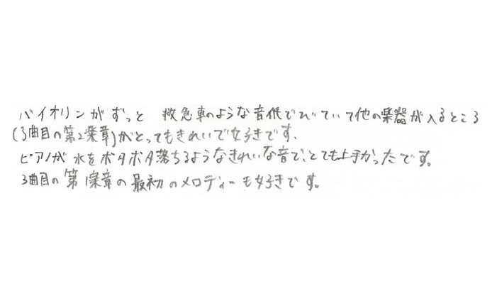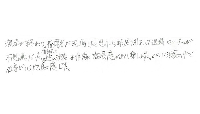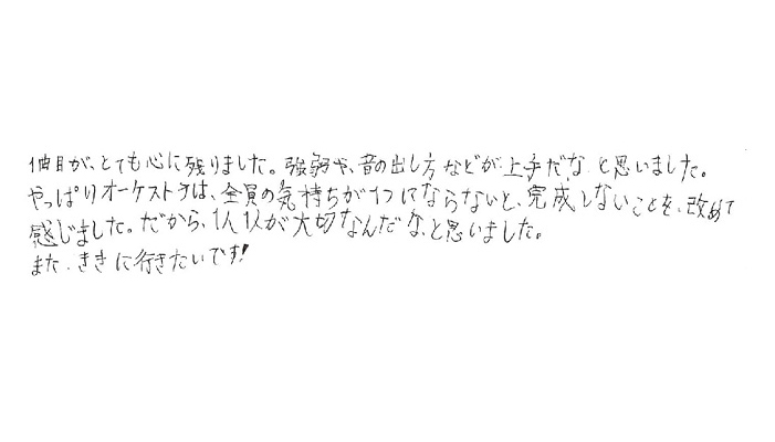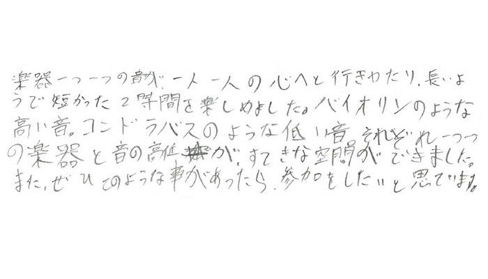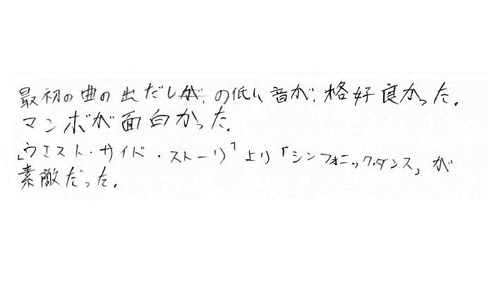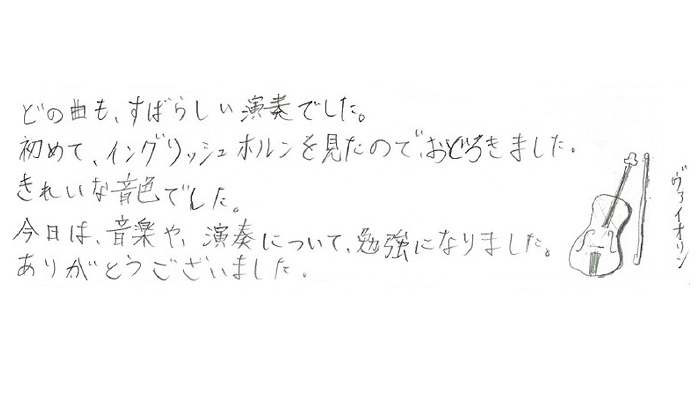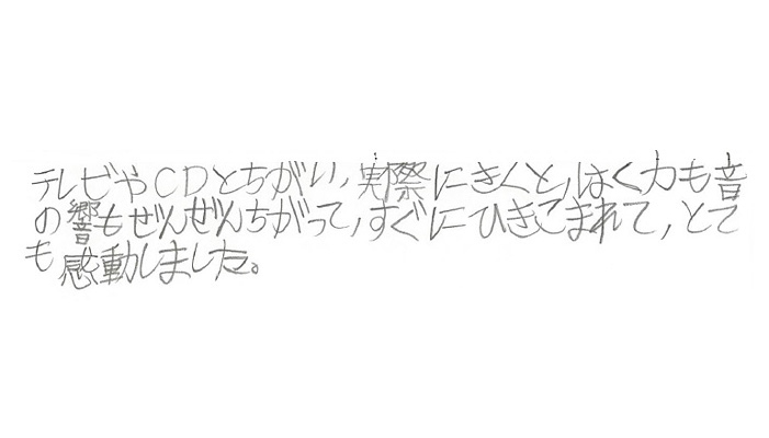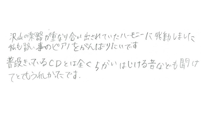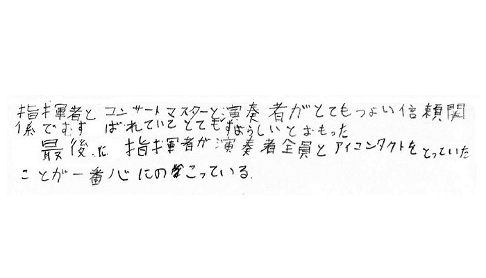 巨匠インバルによるシューベルトとチャイコフスキーの交響曲プログラム。春休みを利用して、初めてのコンサートホールを訪れる子どもが多かったようです。印象に残った楽器の名前を書いてくれた子もいました。普段、学区を演奏しているので、今日聞いた演奏を参考にしたいという声も寄せられました。