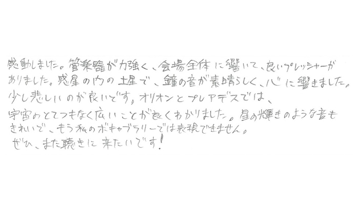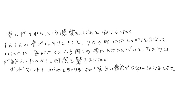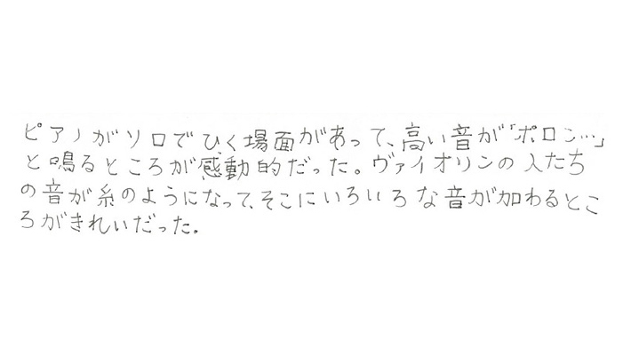 音楽監督の大野和士指揮によるトゥーランガリラ交響曲では、子どもたちは大編成のオーケストラによる音の迫力に驚いたようでした。またこの曲でピアノと共に独奏で使われたオンドマルトノという珍しい楽器の音色を聴けて面白かったという声も多く寄せられました。