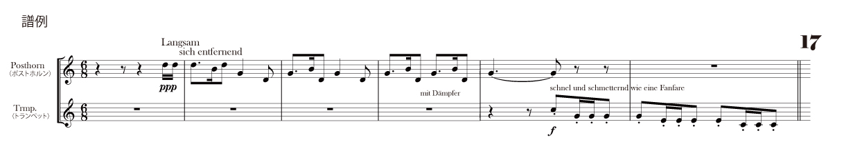 3楽章で私が吹いているところは、夢のところだと感じています。どこからともなく美しい音楽が聴こえてきて、聴いている人が森や草原など、自然の風景を自由に想像するところです。その後、突然ステージ上からミュートを付けたトランペットの音が鳴り響いてきて、夢から覚めるような場面が、私のおすすめです。[練習番号17番前 (譜例)]