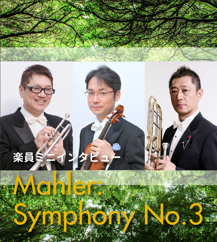 マーラーの交響曲第3番には、「夏の朝の夢」という副題がついているのですが、私はこの曲に対して、一般的に言う「夏」というイメージだけではないものを感じています。なぜなら、マーラーがこの曲を書き始めた1895年に弟さんが亡くなっているからです。特にユダヤ系の作曲者はトロンボーンのソロを神の音として扱うことがとても多いので、その弟の死と何か関係があるような気がしてなりません。この1楽章には、明るいテーマと暗いテーマの2つがあり、トロンボーンソロの前には重苦しい暗いテーマがあるので、弟を亡くしたマーラーの辛い重苦しい心の中を思いながら演奏したいと思っています。