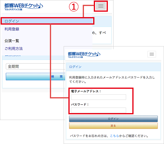 ① 利用登録されている方はメールアドレス・パスワードを入力し「ログイン」
