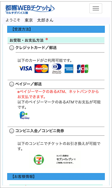 ⑥ お支払い/お受取方法を選択し、請求先、連絡先、 チケット送付先を確認し、