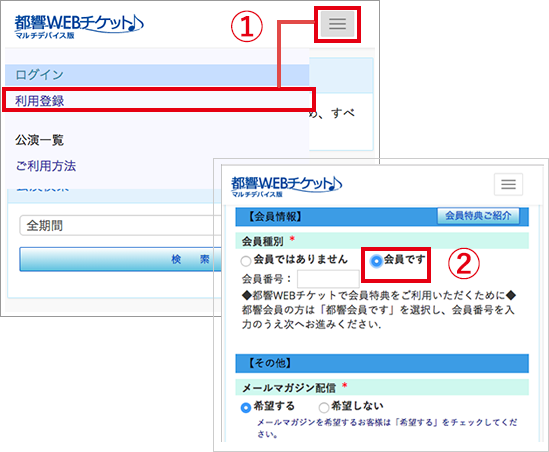 ② 都響会員のお客様は会員情報で「都響会員です」を選択し、会員番号(DMの宛名に記載)を入力してください。